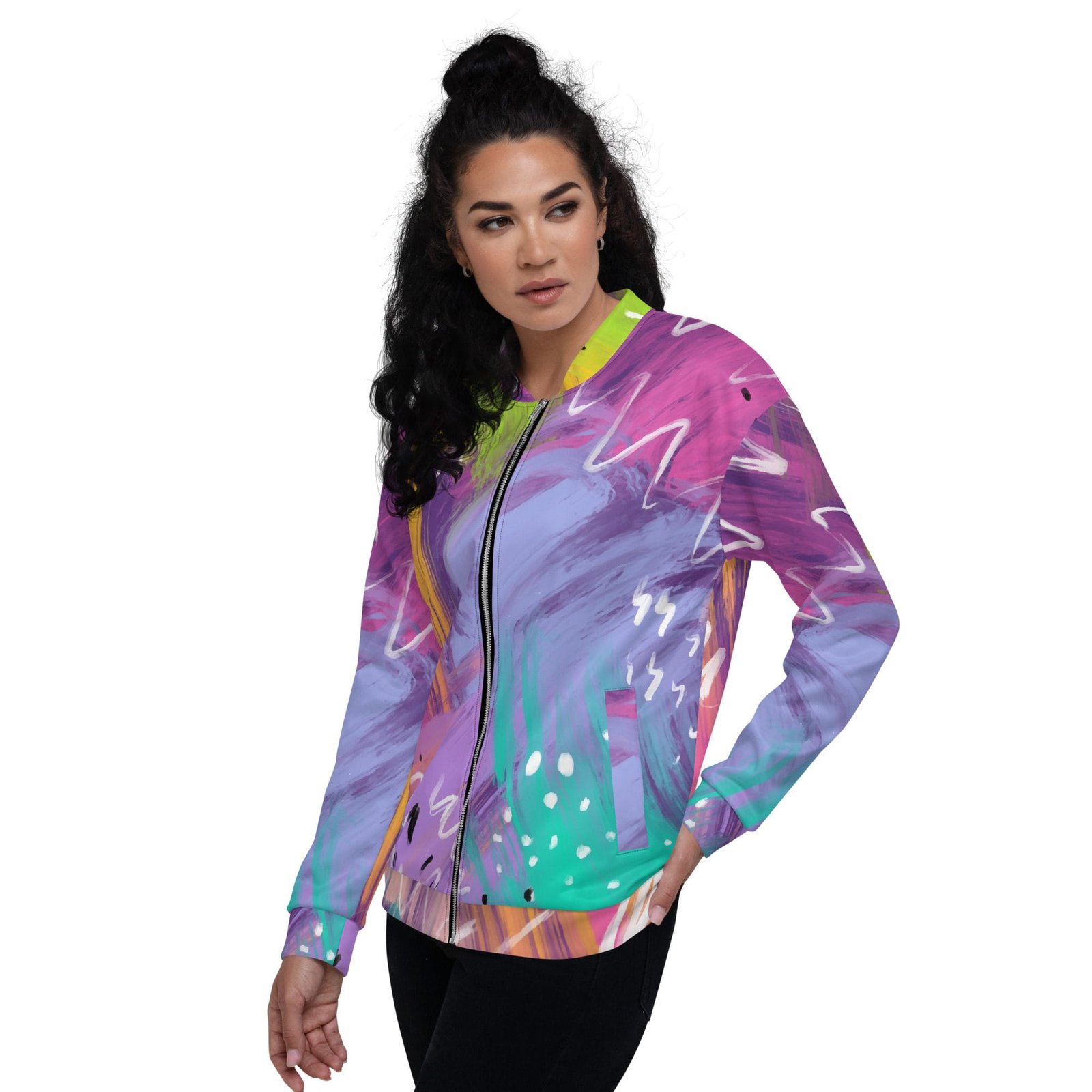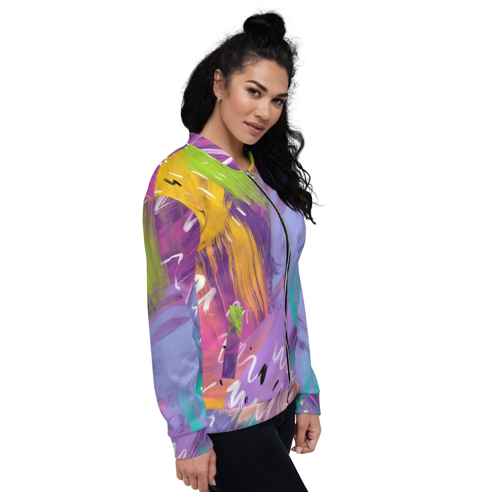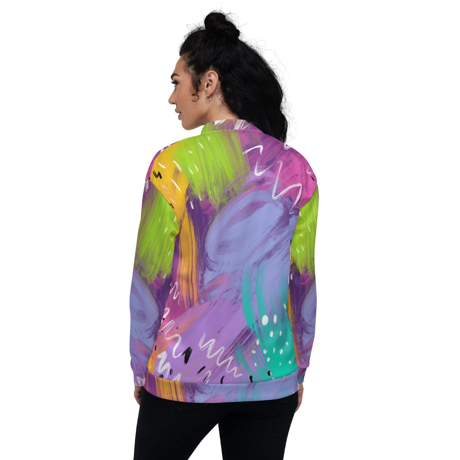 Chaqueta bomber all over unisex «Abstract». Añade un toque colorido a tu armario con esta chaqueta bomber all over unisex. Vístela con una camiseta básica o encima de una sudadera, ¡ideal para cualquier fecha del año! Su interior de paño grueso y suave cepillado y el ajuste unisex harán que esta chaqueta bomber all over sea tu prenda favorita.